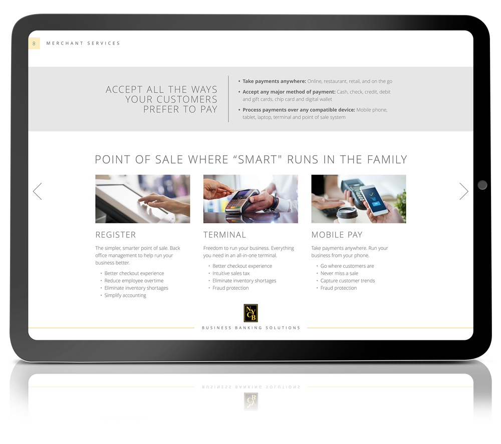 Produce a digital brochure to be viewed on an iPad for bankers to sell business products. The final digital brochure is touch screen compatible with hot links to each section including an interactive menu system and search bar.